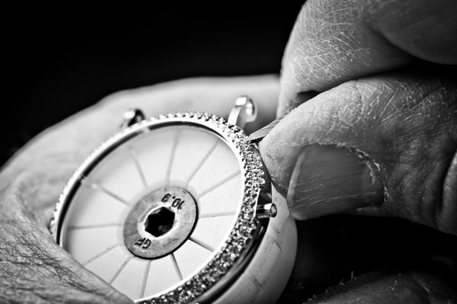 Ein Edelsteinbesatz nach allen Regeln der Juwelierskunst Die neue Flamme®-Fasstechnik wird wie der Edelsteinbesatz bei allen anderen Schmuckuhren der Manufaktur ganz nach den Regeln der Juwelierskunst und unter Einhaltung der Vorgaben des Patek Philippe Siegels ausgeführt. Um den maximalen Glanz und das bestmögliche Feuer zu gewährleisten, müssen die Diamanten den strengen Farbvorgaben „Top Wesselton“ (feines Weiß) entsprechen, von lupenreiner Qualität sein und einen makellosen Schliff aufweisen Der Steinfasser achtet auch sehr genau darauf, dass alle Steine lotrecht, in Achse und höhengleich gefasst werden, damit sie die Rundungen des Gehäuses exakt nachformen und keine Steinflächen hervorstehen.